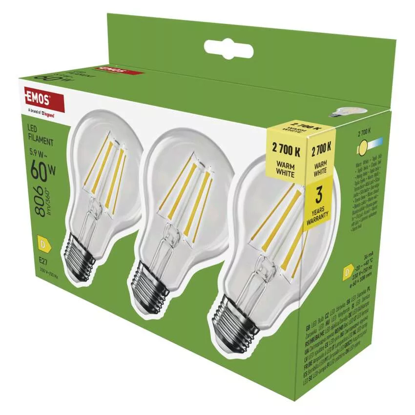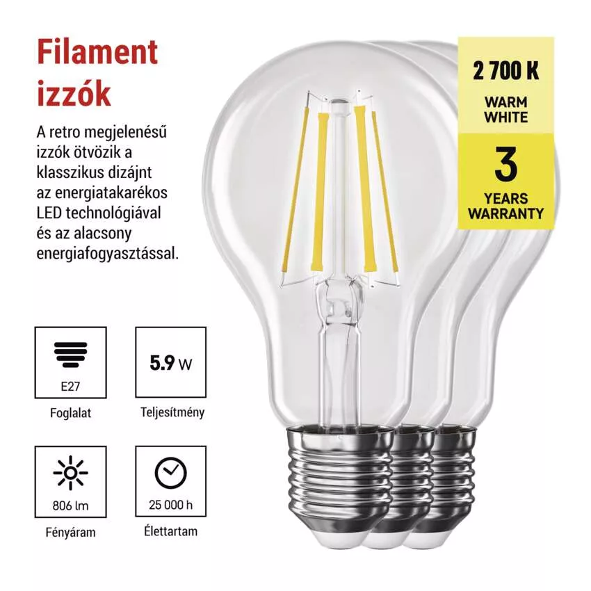 EMOS ZF5D42.3, LED izzó Filament A60 / E27 / 5,9 W (60 W) / 806 lm / Meleg fehér